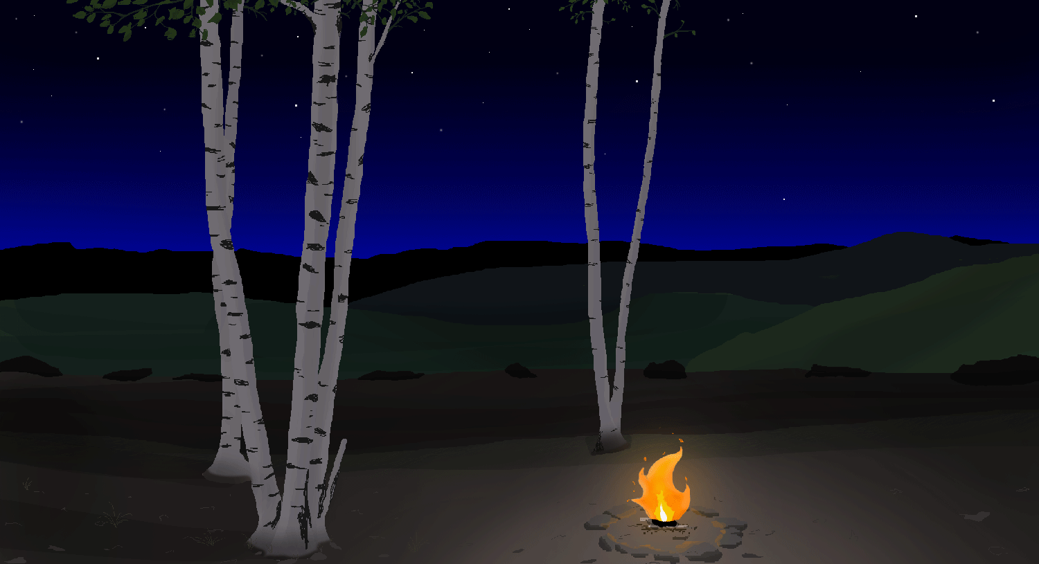 The sun sets on birch trees at Byrdcliffe. In the background, the Catskill Mountains appear as they have when Byrdcliffe was founded in 1903, when the land was mostly pasture.